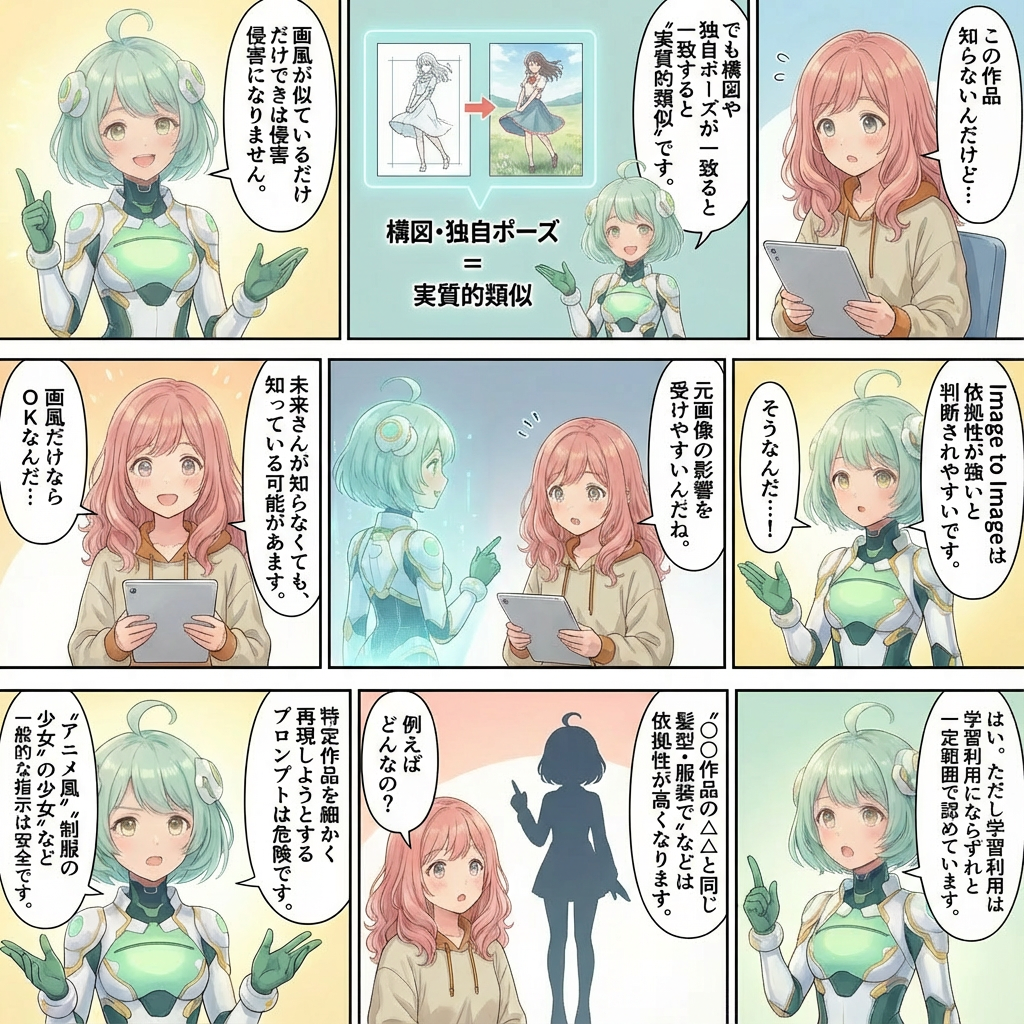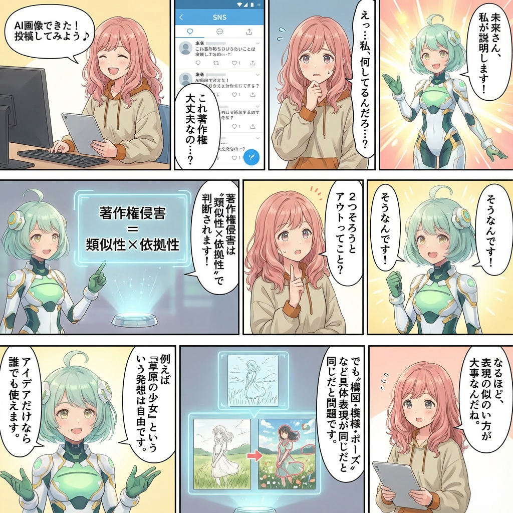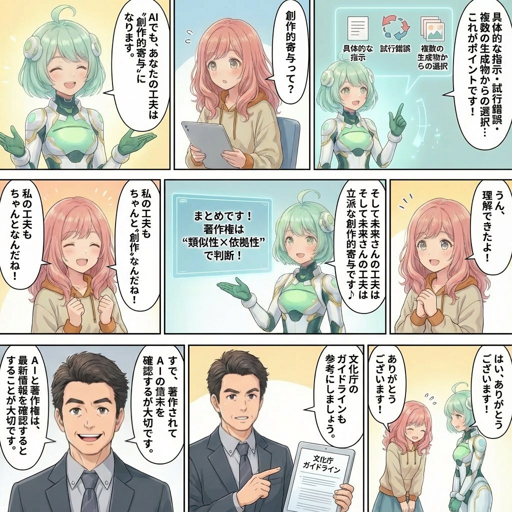私も試しに、以前ブログで取り上げた“画像生成AIと著作権”に関するストーリーを、Nanobanana Proを使って漫画化してみました。結果はというと、正直想像以上。