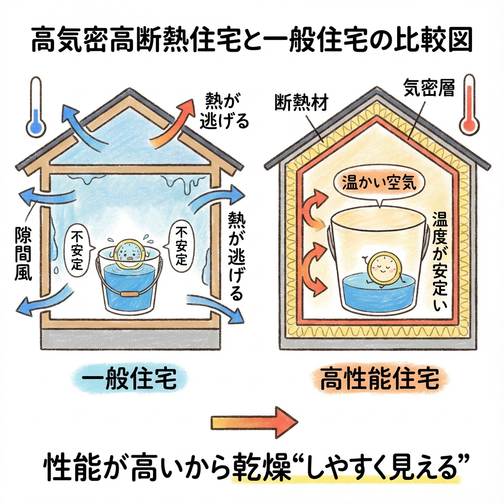 乾燥しやすいことは「高性能住宅だからこそ起きる自然な現象」であり、住宅の質が低いわけではありません。