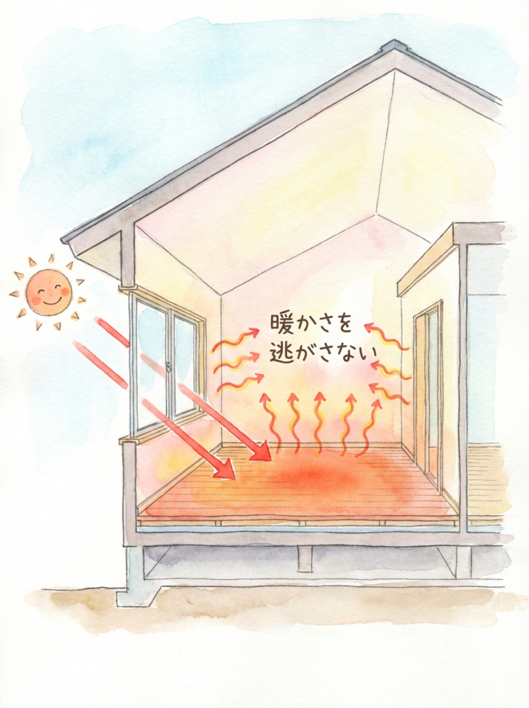 日中に取り込んだ熱が、夜になっても壁や床からゆっくりと放出されるため、朝起きたときも「ヒヤッ」としません。
