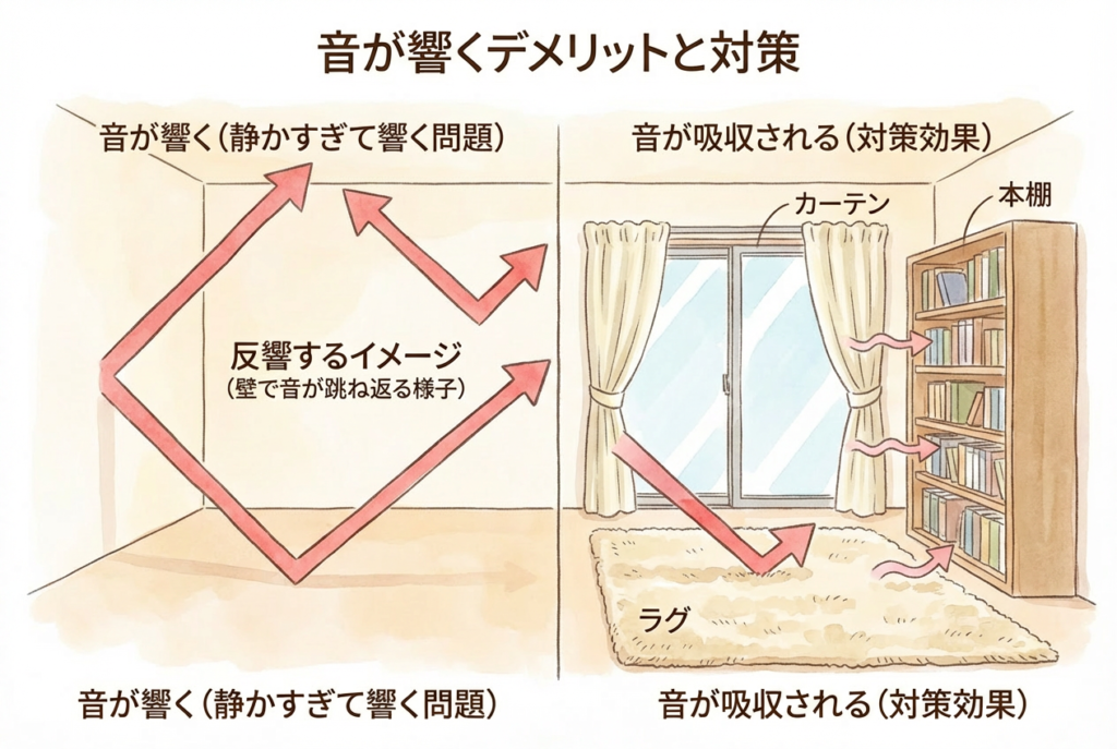 また、音の逃げ場が少ない分、吹き抜けやワンルームのような空間だと、