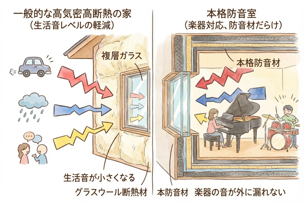 といった “本格防音” を求める場合、高気密高断熱だけに頼るのは現実的ではありません。